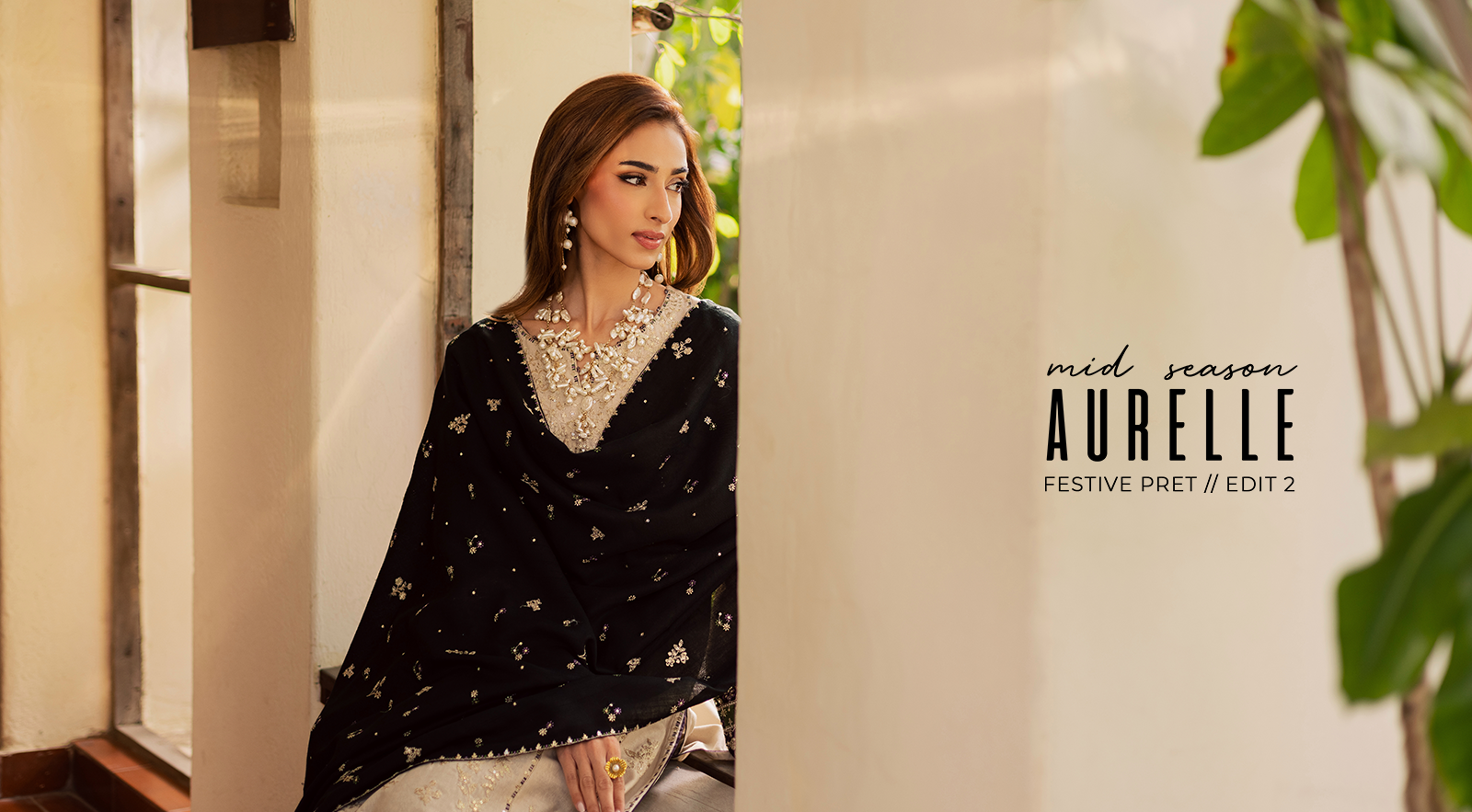 A black embroidered wool shawl completes the set, adding a strong finishing layer.