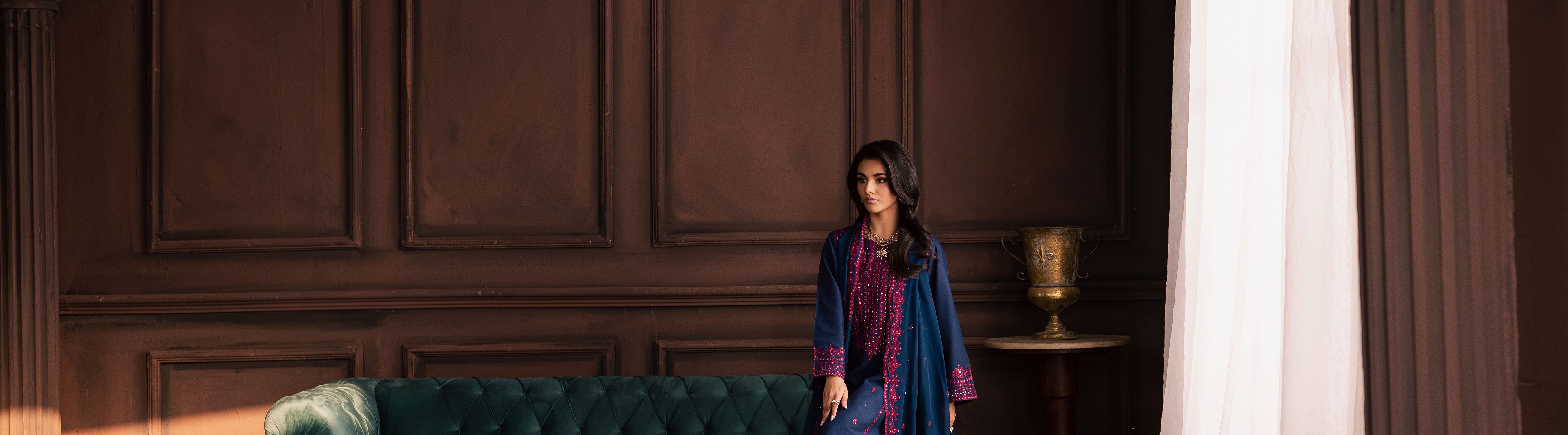 This 3-piece khaddar ensemble is a perfect mix of elegance and comfort, crafted for the winter season. The long shirt features intricate embroidery with a beautifully composed neckline and delicate embroidered spread that enhances its timeless appeal. The sleeves are detailed with fine embroidery and finished with kawya edging, giving the outfit a graceful and polished look.